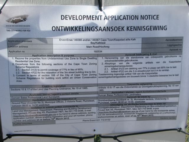 The proposal is for 7 garages and according to the artists impressions available will block much of the view across Fish Hoek Bay looking towards Simon’s Town.  This will further degrade an area already struggling to look tidy (the tidal pool is already completely unused due to vagrants using it as a toilet and bathing area, and general place to pass out drunk). It seems like a particularly stupid and pointless development and so I agreed to feature it on the site.