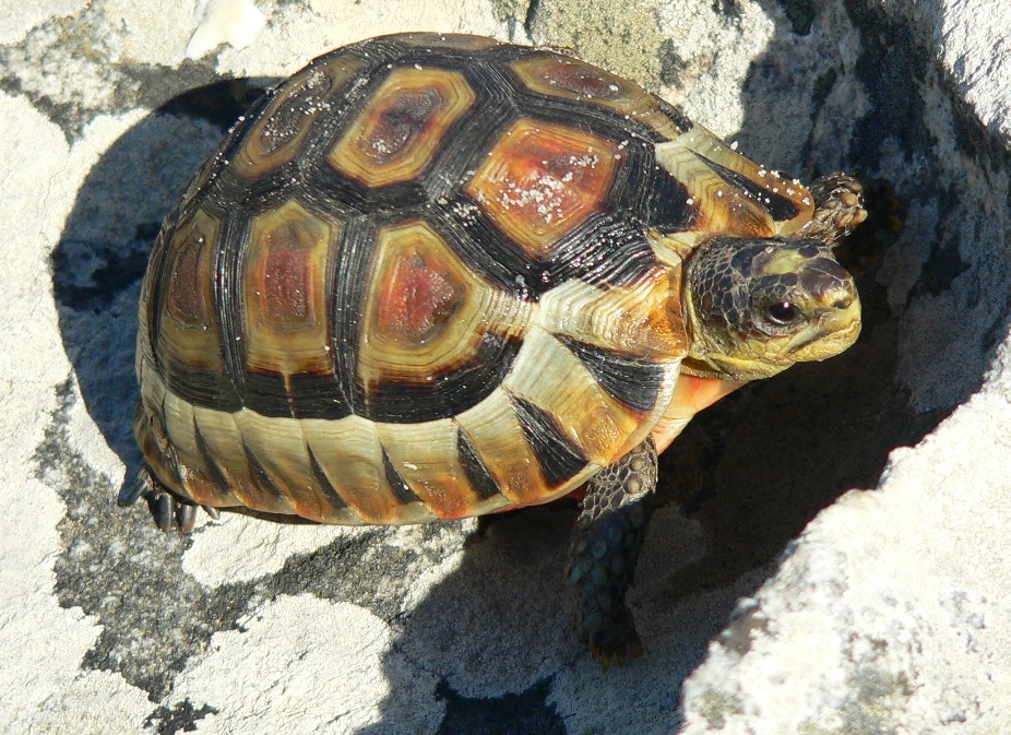 The larger of the species is the Leopard Tortoise, and the least likely to be seen. It is an introduced species, originating from eastern parts of South Africa it is capable of growing as large as 72cm, though I have never seen anything in this area over 25cm. There name suggests a beautiful shell full of distinct spots, which isn’t the case. They have a dull, sandy brown and olive mottled shell the main feature of which is that it is very domed and rounded at the base. Adult tortoises only have one natural predator- fire.