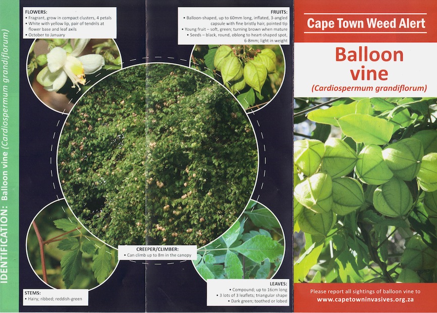 For starters they have an amazing website and identify the types of invasive species and the category that they fall into (the balloon vine is a category 1 invader meaning that it should be removed and destroyed immediately). You can register on the website and then put sitings of invader species into their database, or you can email the unit directly with information. Even if you have already dealt with the invader you should still let the unit know where you saw them and the measures you took to eradicate them. If you find something that you cannot deal with then you can contact the unit for help and advice (they will come and do the removal for you if it is something that you cannot handle, but please bear in mind that they have limited resources, so it would be a big help if you don’t call out a team to pull out a weed for you.)